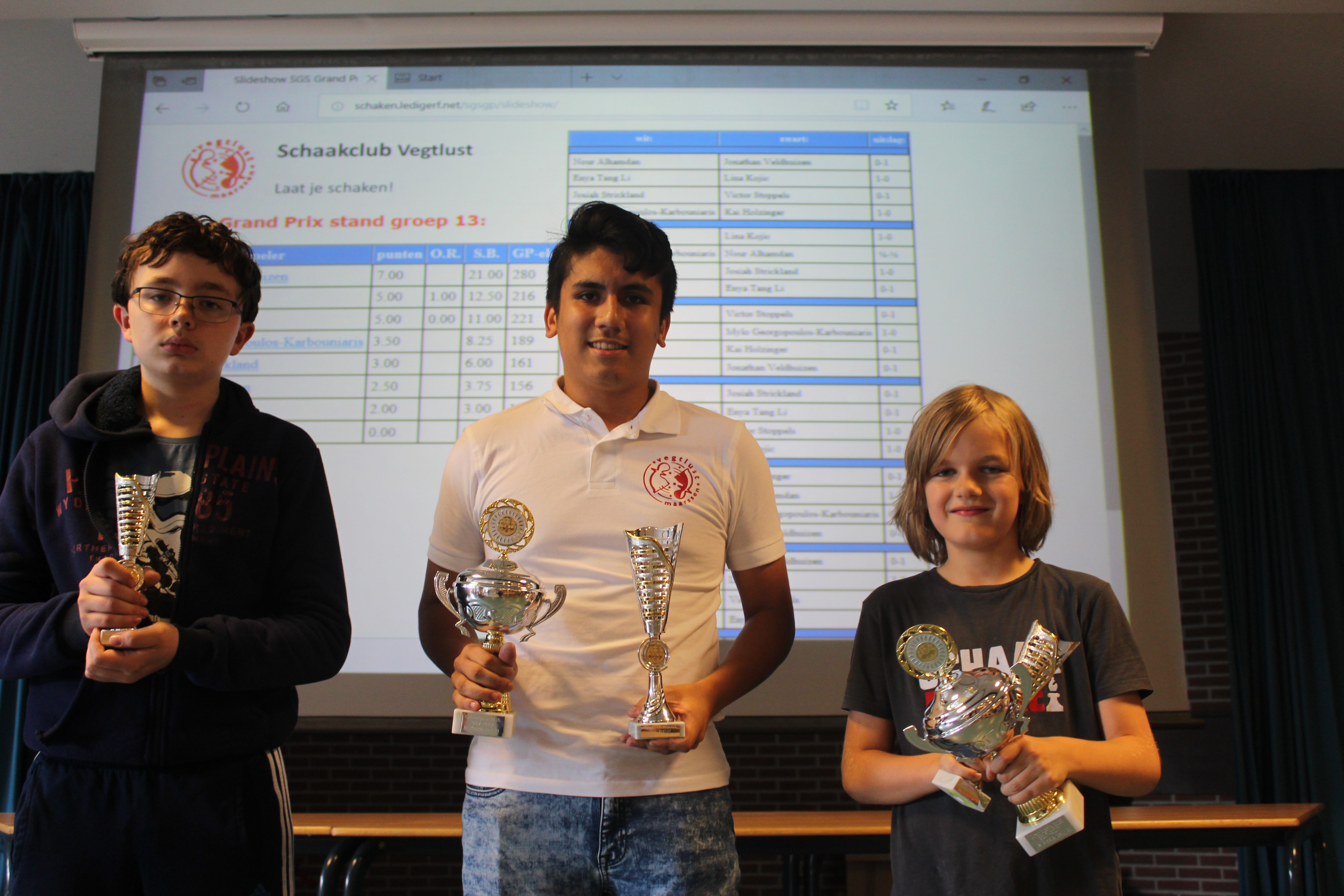 Op zaterdag 9 juni werd in de Rientjes Mavo te Maarssen de negende en laatste SGS jeugd Grand Prix van het seizoen georganiseerd. Door schaakclub Vegtlust. Het was wederom een goed bezocht toernooi, 134 spelers wisten op de vrije, zonnige zaterdag de speelzaal te vinden. Niet alleen de dagprijzen, maar ook de jaarprijzen stonden op het spel. Groep 1 werd gewonnen door Wayan Prins van de thuisclub (zie foto). Hij bleef Polle van Arendonk van Magnus en Eric Starmans van T.S.V. Rochade voor.